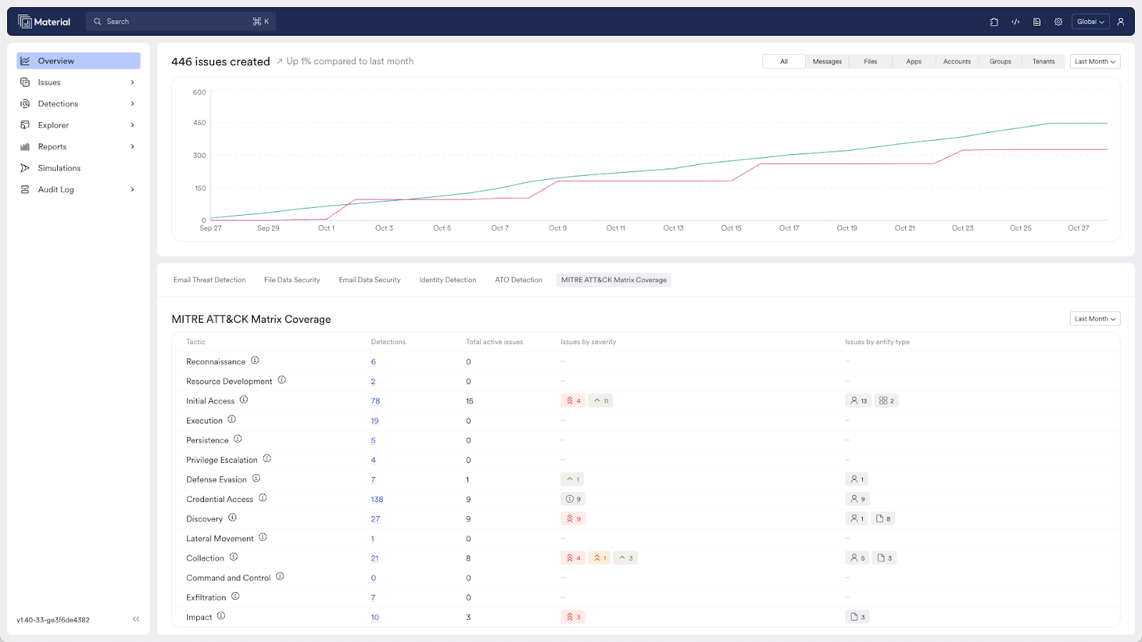 Material відстежує широкий набір поведінкових сигналів — зміни правил пересилання, скидання облікових даних, незвичайний доступ до даних — для раннього виявлення зламаних облікових записів.